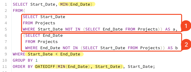 WHERE End_Date NOT IN (SELECT Start_Date FROM Projects)) AS b