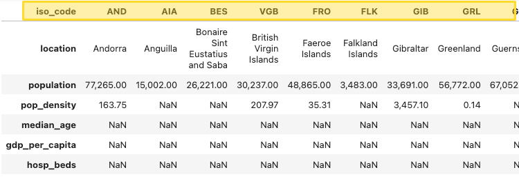 covidtotals.loc[demovars_misscnt >= 3, ['location']+demovars].T